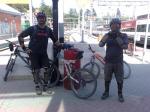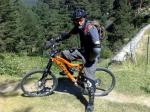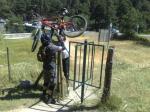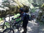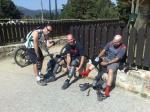 En Valsaín nos esperaba una subida no muy larga pero potente, y también nos aguardaba el primer incidente mecánico que ha obligado a Enrique a abandonar la ruta, porque la patilla del cambio de su Weyless ha quedado totalmente arruinada, doblada y con la rosca del desviador completamente rota, así que hemos desmontado el desviador y acortado la cadena en diferentes medidas intentando que se mantuviera en el plato mediano y el piñón grande para poder terminar la subida, pero no ha habido forma, la cadena se empeñaba en acabar en el plato pequeño y el piñón pequeño. Resultado: Enrique se ha tenido que dar la vuelta a esperarnos en una sombrita.
