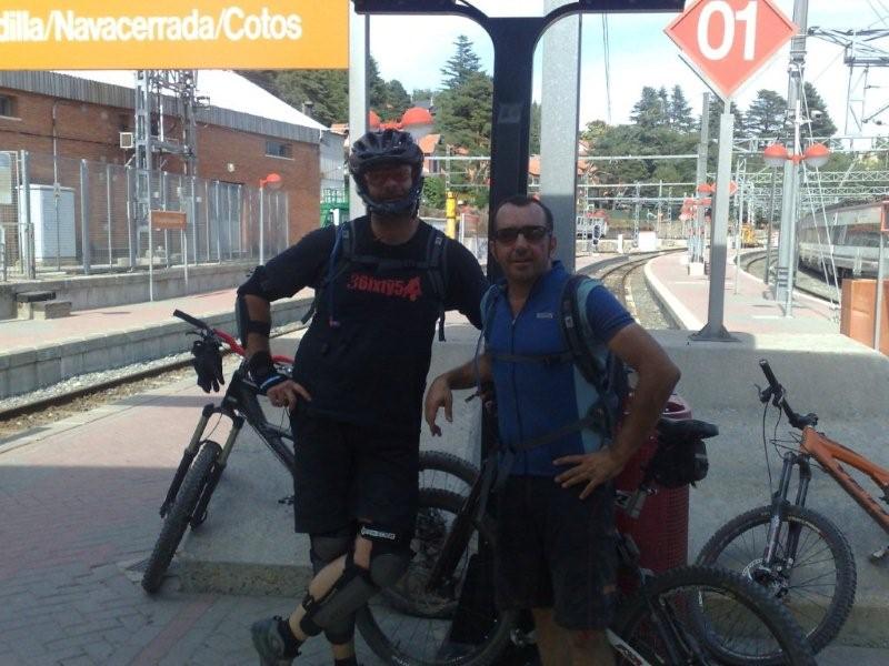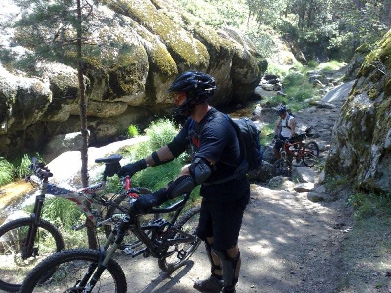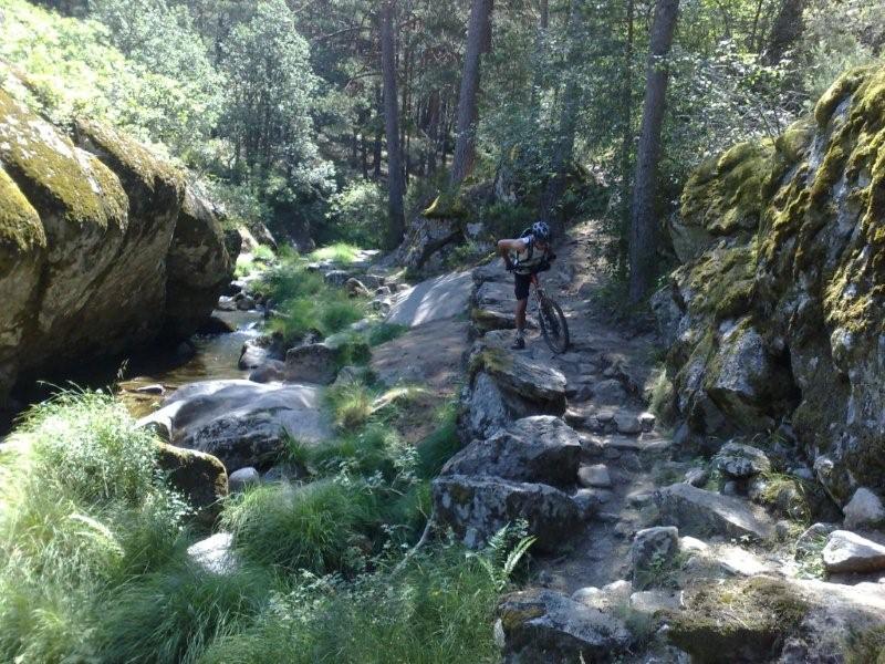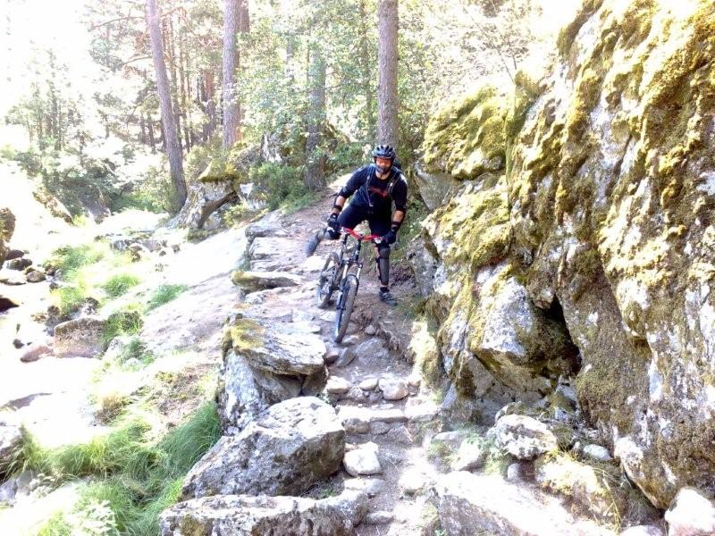 Hemos empezado en Navacerrada, donde hemos ido pedaleando 6Km por carretera hasta Cotos, lugar desde donde comienza el camino de bajada que, entre arboles y pegado al río, nos ha llevado hasta Valsaín. El camino es alucinante, mezclando senderos rápidos con zonas trialeras que en algunos casos nos han hecho bajarnos de la bici.