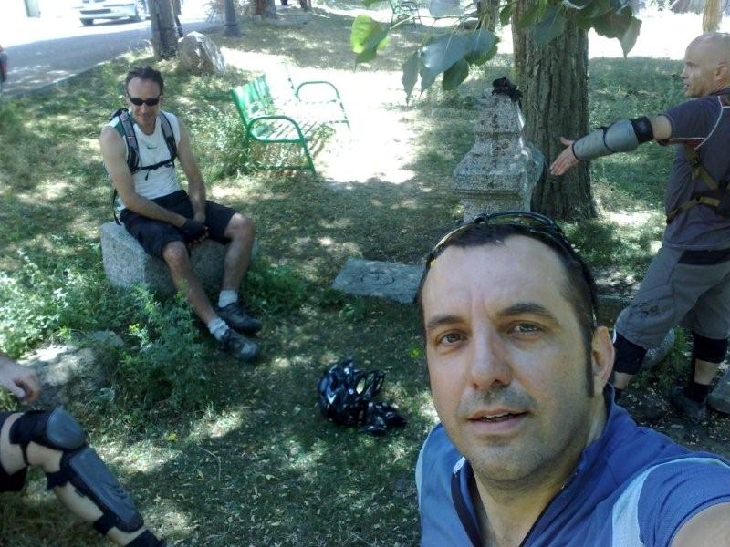 En Valsaín nos esperaba una subida no muy larga pero potente, y también nos aguardaba el primer incidente mecánico que ha obligado a Enrique a abandonar la ruta, porque la patilla del cambio de su Weyless ha quedado totalmente arruinada, doblada y con la rosca del desviador completamente rota, así que hemos desmontado el desviador y acortado la cadena en diferentes medidas intentando que se mantuviera en el plato mediano y el piñón grande para poder terminar la subida, pero no ha habido forma, la cadena se empeñaba en acabar en el plato pequeño y el piñón pequeño. Resultado: Enrique se ha tenido que dar la vuelta a esperarnos en una sombrita.