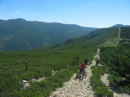 una vez en la cuerda, seguimos subiendo por una pista muy, muy empedrada y con gran pendiente, que nos hace subir las pulsaciones hasta tener que poner pie a tierra y empuja bici hasta la praderita donde comienza la gran trialera de san benito