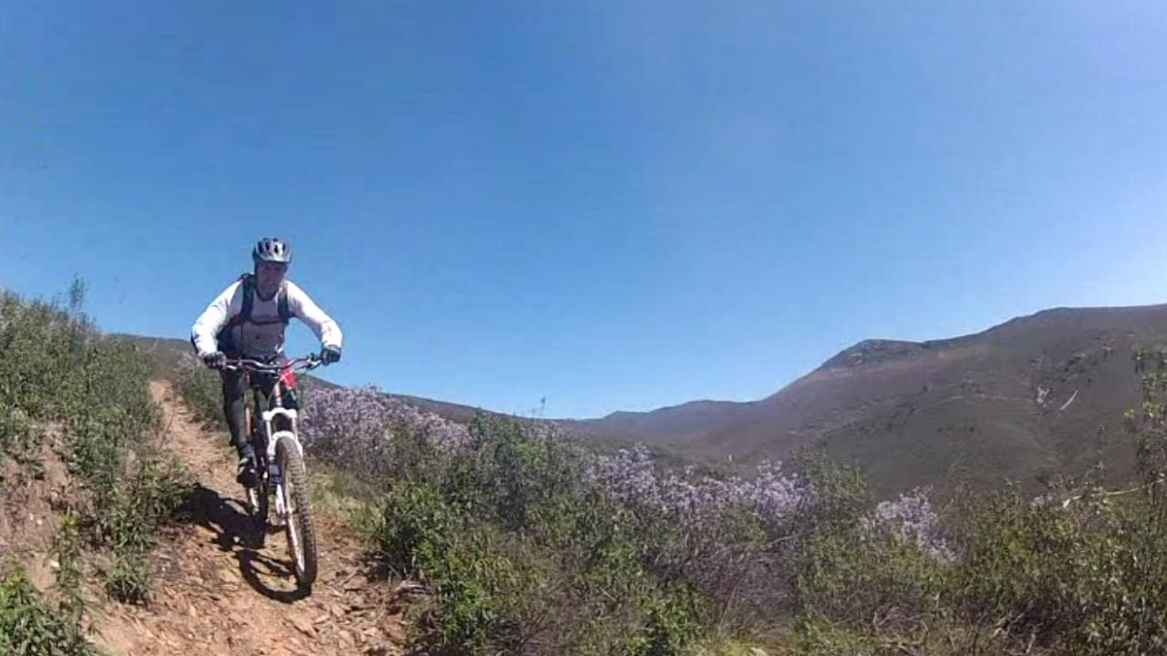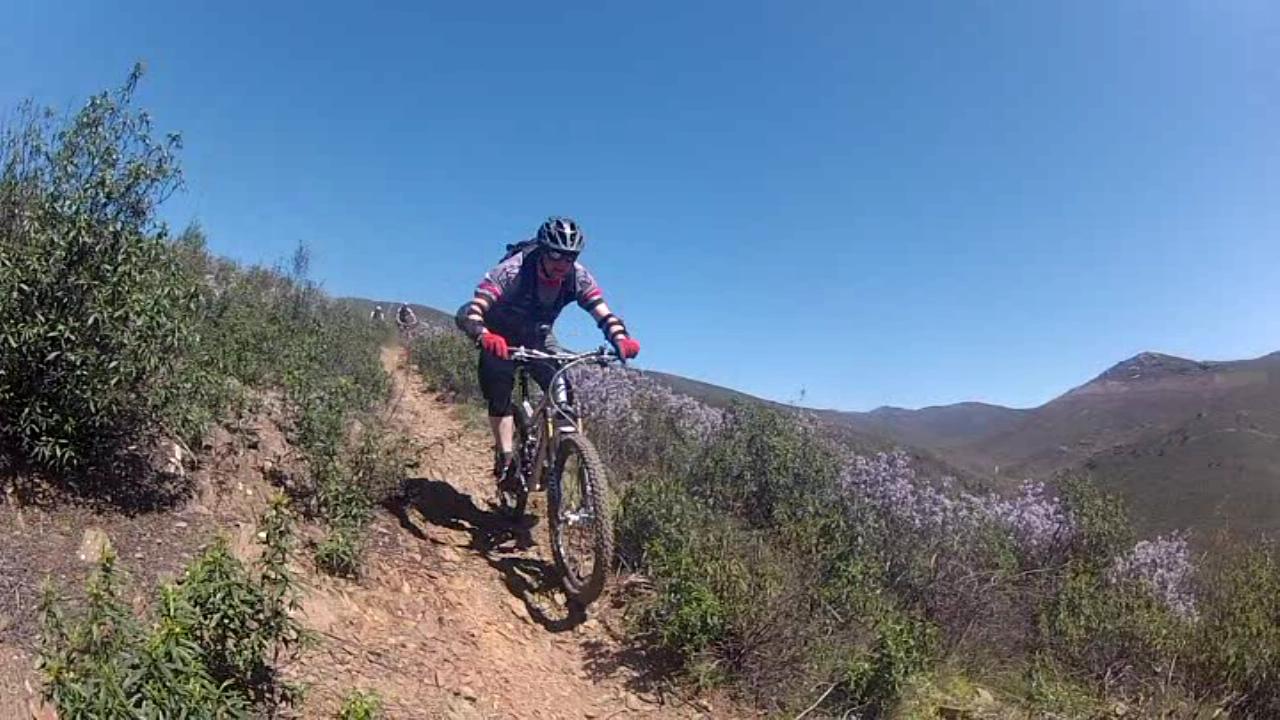 el primer ascenso lo comenzamos por un gr muy divertido y tecnico, a la par, que en partes cerrado por la vegetacion floreciente, para enlazar con la pista que sube hasta la cabeza Anton. Esta pista aunque un poco pestosa, es llevadera, menos los ultimos kilometros que los grados de la pendiente aumentan sin tregua.