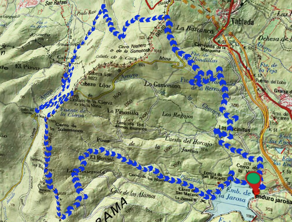 La ruta parte del primer parking del embalse para empezar ascendiendo por pista,  senderos y camino carretero hasta la carretera que nos llegara al collado de la Mina para subir sendeando por una trialera hasta el refugio de la cerro de Salamanca.