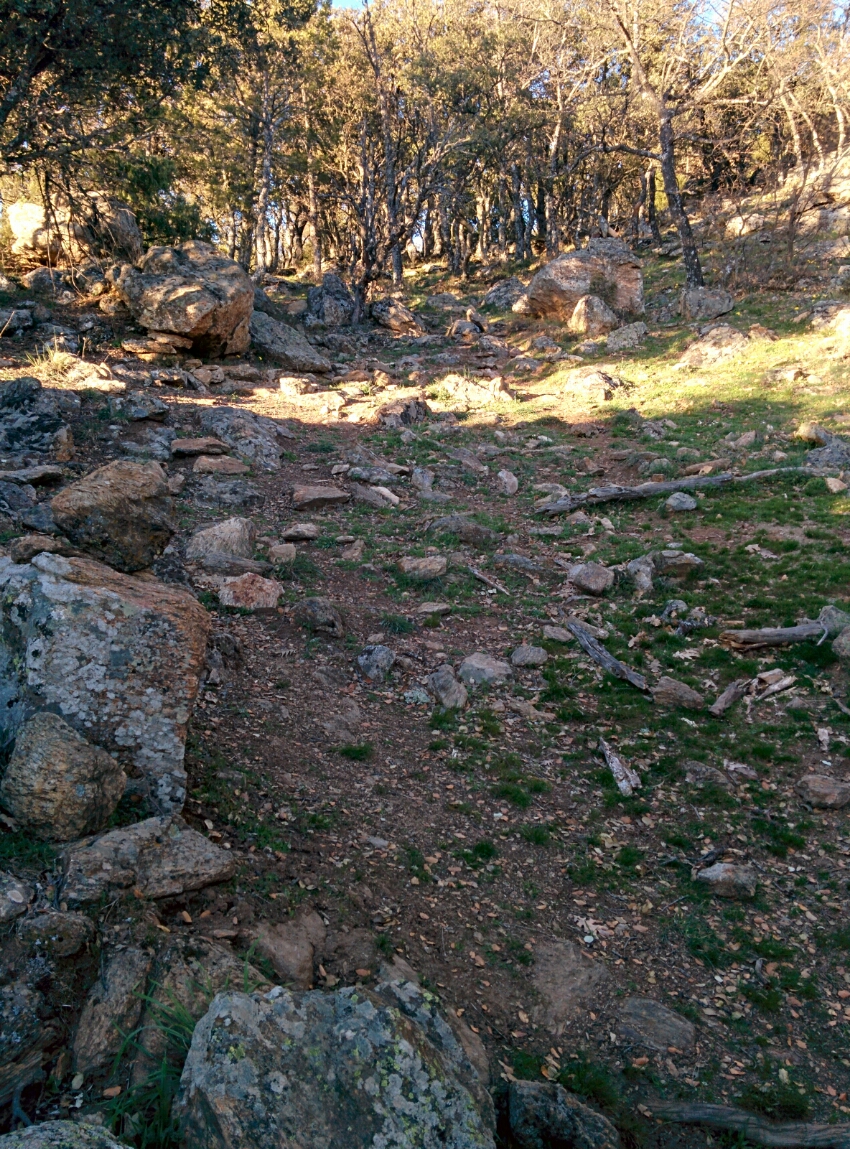 Cresteo un poco siguiendo las rodadas se los todoterrenos de los cazadores y tras un sube-baja, me cruzo con unos gamos que se asustan al oírme y continuó por un sendero de andarines marcados con hitos hasta la peña.